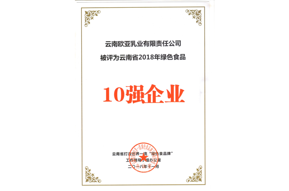 2018年度云南省綠色食品10強(qiáng)企業(yè)
