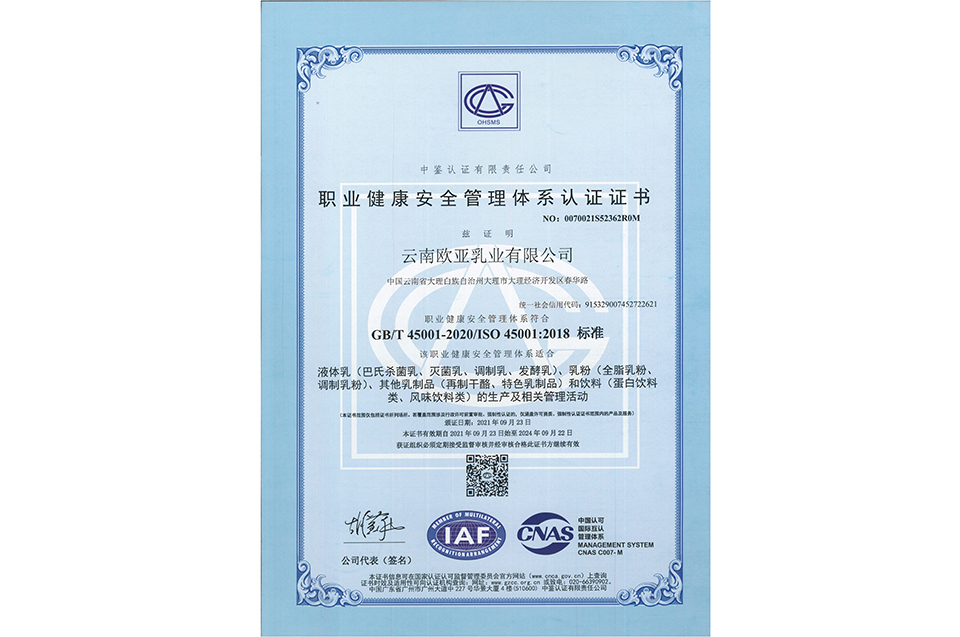 職業健康安全管理體系認證證書