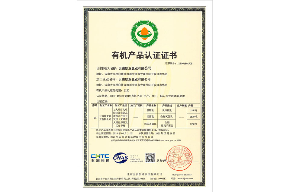 有機產品認證證書(乳品)